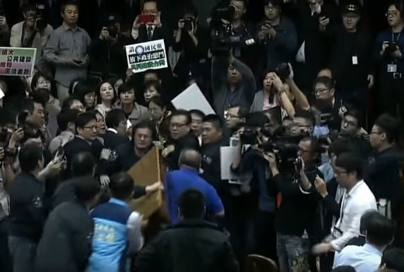 【台灣醒報記者吳宇涵綜合報導】「錢瞻賤設,退回重議!」立法院經濟委員會等6會26日進行「前瞻基礎建設特別條例草案」逐條審查,但會議開始後約半小時,國民黨為反對草案宣讀,和民進黨立委在國會上演全武行,扛桌砸主席台、潑灑咖啡等,無所不用其極地杯葛議事進行,民進黨立委見狀趕緊包圍主席台,保護主席邱議瑩,並開始宣讀條文,前後約20分鐘完成初審。