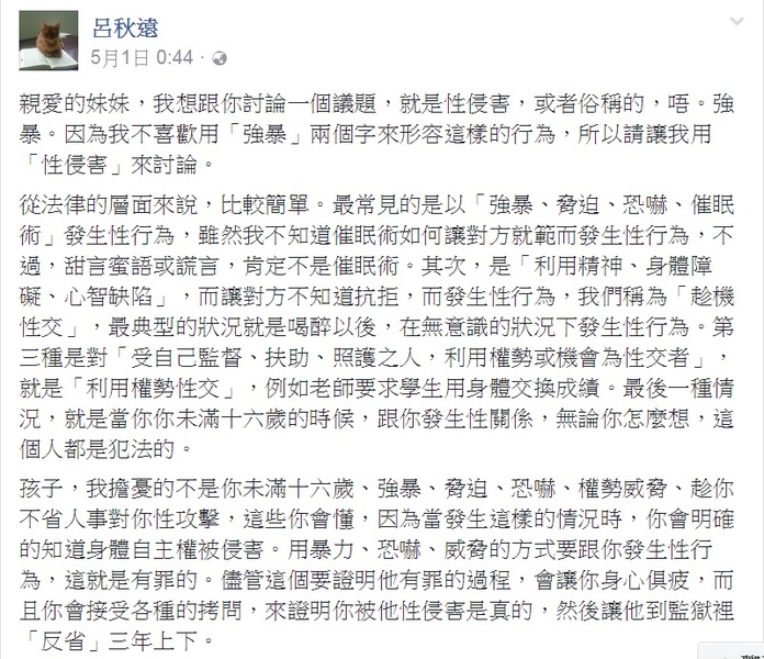 女作家自殺身亡之後,呂秋遠律師曾寫一篇告訴女兒如何面對「性」的文章,引起很多人按讚轉貼。我覺得一開始呂律師的分析很好,特別指出強暴、脅迫等方式性侵還不是最可怕的,更可怕是孩子被所熟識、崇拜的大人用外表溫柔,裡面粗暴的方式來性侵。