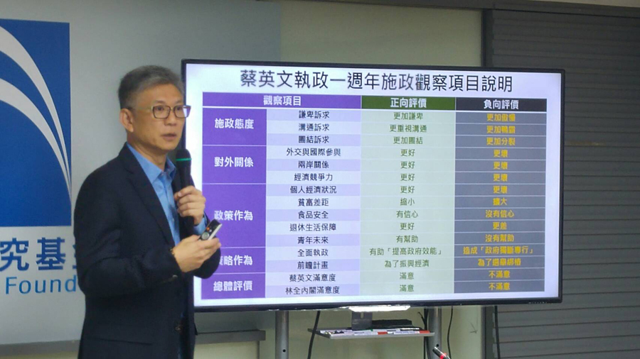 【台灣醒報記者鄭羿菲台北報導】總統蔡英文即將迎來執政週年,藍營智庫「國家政策研究基金會」在10日公布有近6成民眾不滿其施政。「國民黨在2014年大敗的原因是食安、貧富差距等兩項做不好,而這2項也是民進黨須注意的。」文化大學政治系教授楊泰順10日在記者會上表示。中國文化大學法律系副教授吳盈德說,「現蔡政府施政的優先順序,並非民眾最關心的項目。」