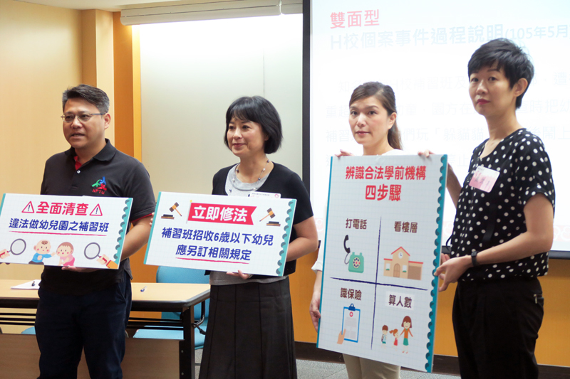 林月琴對此提醒,家長將孩子送往學前機構前,可以執行4個步驟,讓違法補習班無所遁形:一、打電話詢問各縣市教育局確認該機構是否有正式立案;二、和校方要求檢視立案證書,確認核定招生的人數是否正確,或有違法超收情形;三、幼兒園的活動樓層僅限地面上1~3樓,家長若發現幼兒上課的教室在地下室,要有警覺心與疑心;四、向學校要求看學生團體保險的投保資料。