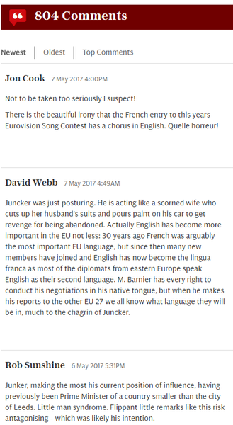 盧森堡出身的榮克5日義大利的「歐盟國情咨文」發表中,強調英國的脫歐是齣「悲劇」。他用英文表示,自己曾在英法文兩種語言之間選擇要學好哪種,最後選了法文,如今英國要離開歐盟,「英語勢必漸漸喪失它的語言地位。」隨後榮克便以法文進行餘下的國情咨文。