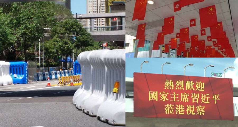 香港警方以反恐為名嚴防反對聲音,相反,各式「慶回歸」及「歡迎習主席」的橫額,則「佔領」香港多處地方,例如在習近平將會到訪的石崗解放軍軍營附近,便出現大量迎習橫額,包括達三層樓高的巨型花牌,上面寫上「八鄉鄉民熱烈歡迎習近平主席」;在西區海底隧道的收費廣場行人天橋,也出現大批迎接習近平訪港的巨型標語,另外亦有大型商場在外牆,掛上簡體對譯的橫額。