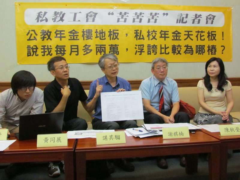 【台灣醒報記者張嘉琦台北報導】公私校退休金差很大?私校教授退休最多平均可月領9萬?公私校退休金差異引發爭議,私教工會5日舉辦記者會「公教年金樓地板,私校年金天花板,說我每月多2萬,浮誇比較為哪樁?」私教工會副理事長陳秋瑩說:「在過度理想且不符現實的情況下,將公私校退休金作比較是不公平的!」