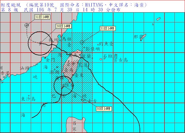 根據中央氣象局觀測,今年第10號颱風海棠中心位置30日下午2時在鵝鑾鼻的西南西方約80公里海面上,正以每小時22公里速度向東北轉北移動;至於第9號颱風尼莎已經遠離,中央氣象局30日下午2時30分已正式解除尼莎颱風海上陸上颱風警報。