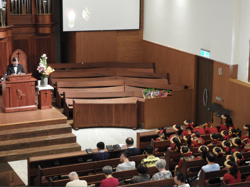 台灣基督長老教會大稻埕教會6日邀請「希望兒童合唱團」進行聯合禮拜,一群來自屏東排灣族的小朋友們,身穿黑色排灣族服飾、頭戴花圈,專心聆聽台上牧師的教誨,將這次長征旅途所有榮耀成就歸於上帝。