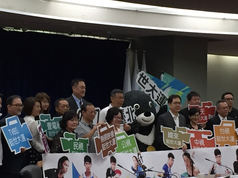世大運倒數5天!各大電視台數位媒體高層14日上午首度齊聚一堂,包括華視、公視、民視等轉播單位均到場參加,以行動表達出力挺世大運轉播的決心。台北市長柯文哲開玩笑表示,14日是影視產業重要的一天,蔡英文假如有天要把電視台裁掉都不會吸引這麼多總經理來。