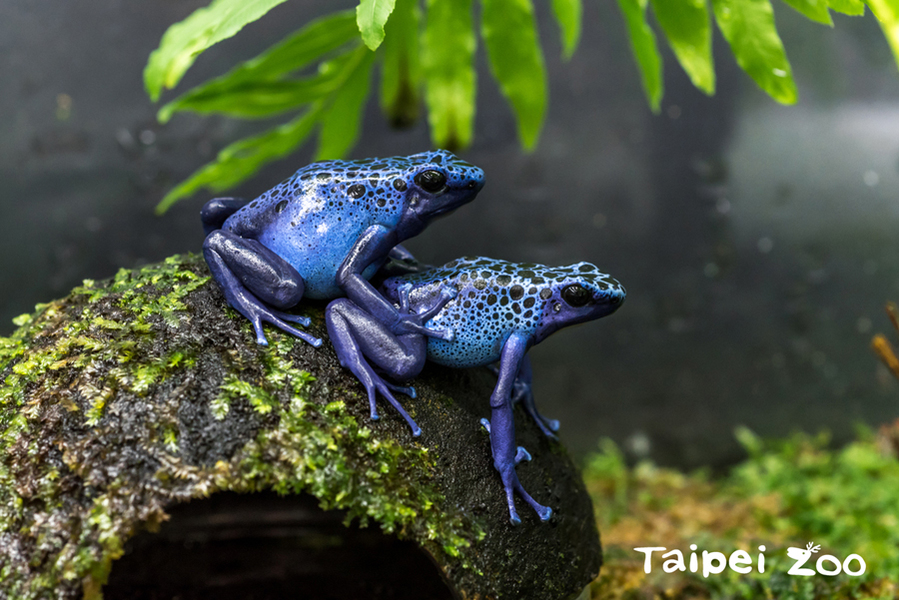 一身「鈷藍」的亮麗顏色,吸引漫步在兩棲爬蟲館的民眾駐足觀察鈷藍箭毒蛙的生活,而近日牠們逐漸性成熟,紛紛進入求偶、繁殖的階段。曹先紹23日受訪時表示,鈷藍箭毒蛙原本的生活環境是中南美洲的熱帶叢林,因此繁殖時是一直在下雨的潮濕環境,園方特地用噴水效果模擬下雨的天氣,讓牠們能順利配對。