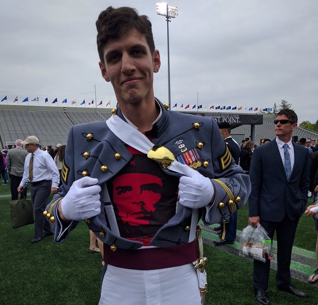 美國《陸軍時報》披露了這起風波,史賓塞‧拉波尼臉書上公開了2張照片,攝於去年的西點軍校(即美國陸軍官校)畢業典禮,一張是手裡拿著帽子,帽子內裡以英文寫著「COMMUNISM WILL WIN」(共產主義必勝);另一張是他掀開外套,露出T恤,其上繪有共產主義革命者切•格瓦拉的頭像。