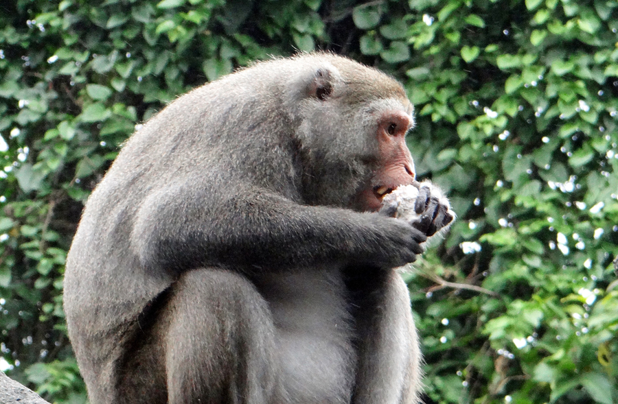 「台灣獼猴有階級觀念,必須一顆一顆分配,否則最後只會落到猴王和地位較尊貴的母猴們的手中。」負責照顧獼猴的保育員說,每隻獼猴拿到香芋後,就會找個好位置坐下品嚐,先吃完的獼猴還會仔細搜尋看附近有沒有掉在地上的小碎塊,那種吃完了還想再吃的渴望,連遊客們看了都嘴饞。