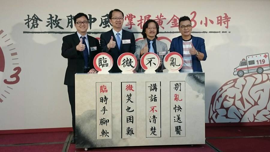 台灣神經學會理事長王署君醫師、台灣腦中風學會理事長葉守正醫師、台灣腦中風病友協會理事長胡朝榮醫師,與衛教大使沈玉琳共同出席記者會,教導民眾腦中風徵兆的4口訣:「臨」時手腳軟、「微」笑也困難、講話「不」清楚、別「亂」快送醫。