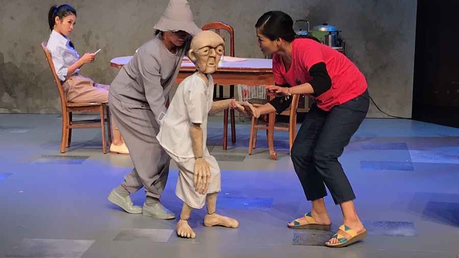 舞台上老伯伯戲偶一舉一動都得靠演員攙扶,將年長者孱弱的形象、外籍看護的細心照顧刻劃到位。(photo by 廖玄宇/台灣醒報)