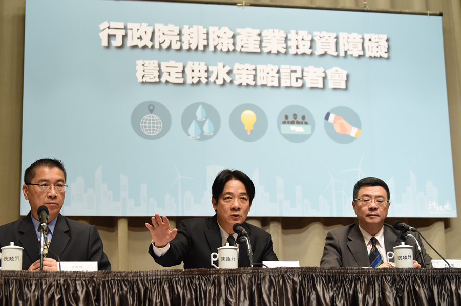 「台灣供水碰到產業用水成長、輸水效率偏低、水源分布不均,及備援供水不足等4大問題,政府將以開源、節流、調度、備援4大策略應對。」賴清德7日在記者會上宣告,務必要在120年前達到全台「供水無虞」的目標,在北部地區,109年將完成桃園支援新竹幹管工程 ,讓翡翠水庫可支援新北市、石門水庫支援桃園與新竹縣市,屆時北部地區每日將可供給207萬噸,不僅高於需求的194萬噸,還有13萬噸備用。