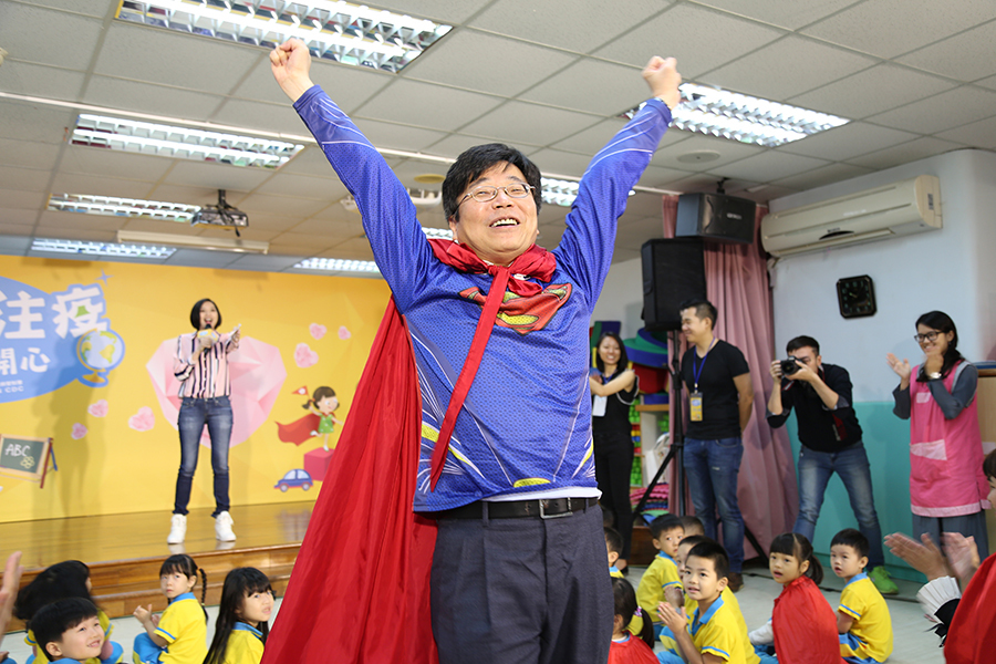 【台灣醒報記者廖玄宇台北報導】穿上胸口有斗大S字母的藍色上衣、披上火紅色的披風,疾病管制署署長周志浩22日,化身為保護民眾的防疫超人,前往台北市立萬華幼稚園,宣導學齡前幼童流感疫苗接種。