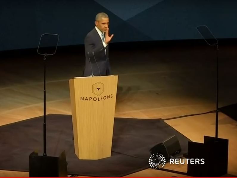 「只是我承認,美國在領導氣候問題上暫時缺席了。」歐巴馬沒有提到伊斯蘭恐怖主義和難民的挑戰,但針對「氣候變遷」問題代替川普道歉,引發台下陣笑聲。他更說到,要提倡女性多擔任領導人,因為「男性近日似乎出現了一些問題」,言下引用了左派的「生態女性主義」,暗指男人在目前席捲美國的「連環性醜聞」和「環境議題」皆為主要的壓迫者;妙語引爆台下如雷掌爭。