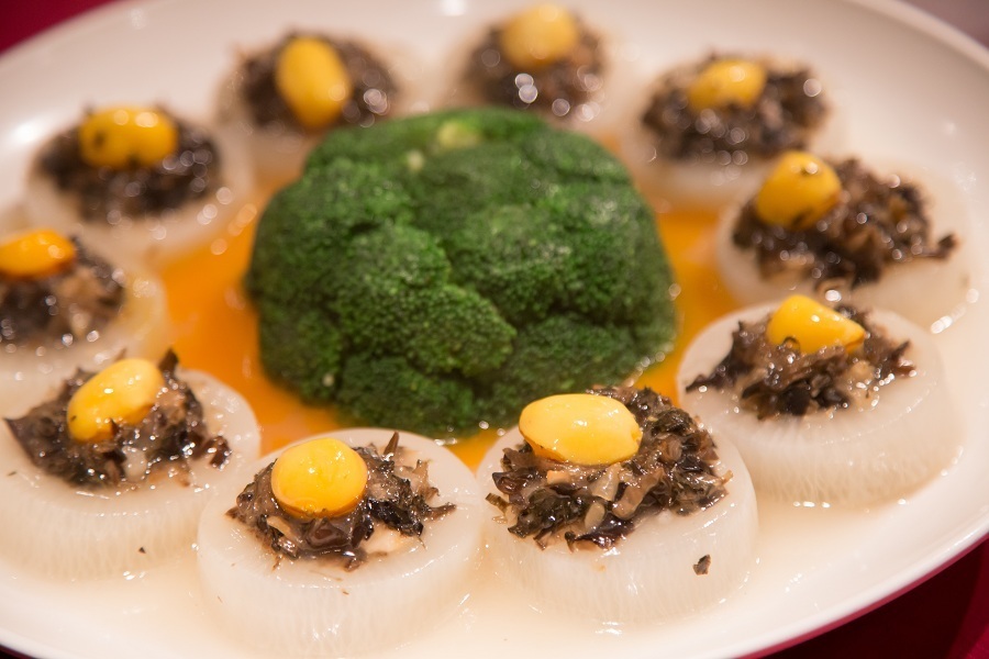 潘錦亮將傳統客家料理,包括福菜、梅干菜、客家酸菜等,結合在地海鮮食材,以創意變化奪下冠軍。(photo by 客家委員會提供)