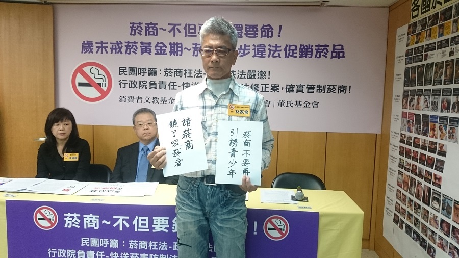 曾經菸齡長達30年,15歲開始抽菸,45歲被診斷喉癌第4期的林家修,因做了全喉切除手術,無法像一般人一樣用言語順暢溝通,花了3年時間苦學食道語,從發出聲音到單字、片語、構成句子,必須重覆不斷練習,且每次說話都是無法想像的吃力。他在記者會上沉默舉牌:請菸商饒了吸菸者!