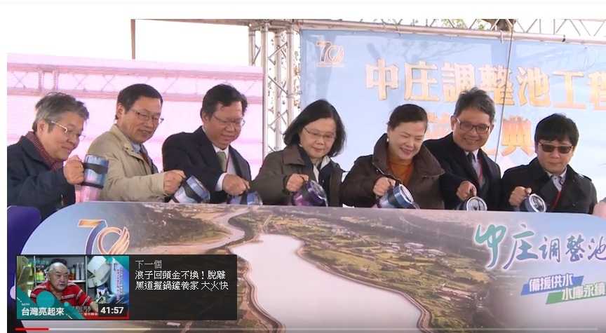 蔡英文表示,第一個加快腳步已經完成,也就是一系列的石門水庫整治計畫,以及17日完工的中庄調整池。未來水源濁度過高時,就能適時提供備援用水,降低缺水風險。水庫也能夠在滿水時,全力進行水力排沙、減少淤積。