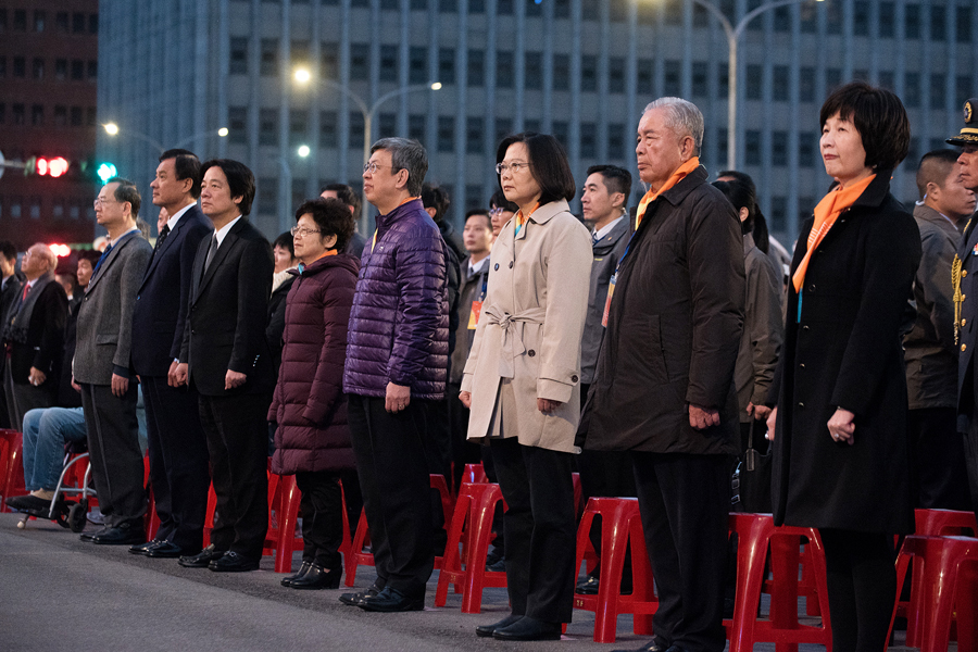 【台灣醒報記者鄭羿菲台北報導】2018總統府前元旦升旗典禮中,總統蔡英文大方開口唱滿國歌,沒跳過「吾黨所宗」等句;而前總統馬英九、國民黨主席吳敦義則與2017年元旦積極參與不同,馬提前南下高雄參與升旗,一早吃早餐的現場直播還吸引了11萬人觀看,而吳敦義則在中央黨部前廣場「自辦」升旗典禮,率數百位黨員參與。府前升旗典禮現場,也有不滿原民政策、勞基修法的民眾抗議。