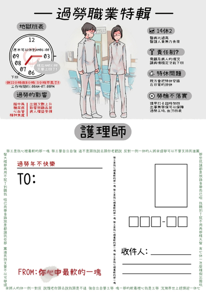 【台灣醒報記者鄭羿菲台北報導】「層層拒馬讓民眾無法表達反修勞基法的意見給總統府,那就寄明信片讓民進黨政府看見民眾的怒氣!」國民黨發言人黃建豪7日在記者會上展示包括護理師等10大過勞職業的明信片,並交給勞工代表們書寫。台灣護師醫療產業工會理事長陳玉鳳寫下,「不要讓護理師過勞死,不要輪班間隔8小時!」並抗議拒絕修惡勞基法。