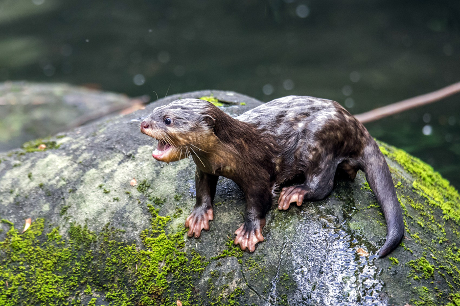 終於可以看見小爪水獺一家在戶外活動場追趕跑跳碰了!曹先紹10日受訪時表示,三寶們在3日還在室內水池練習游泳,在爸、媽、哥、姊的細心教導下,泳技逐漸熟練,便讓三寶們跟著一起到戶外活動場,初到戶外活動場的3寶,不斷跟在「大人們」屁股後跑進跑出,飛快地跑來跑去,宛如3個小小跟屁蟲。」