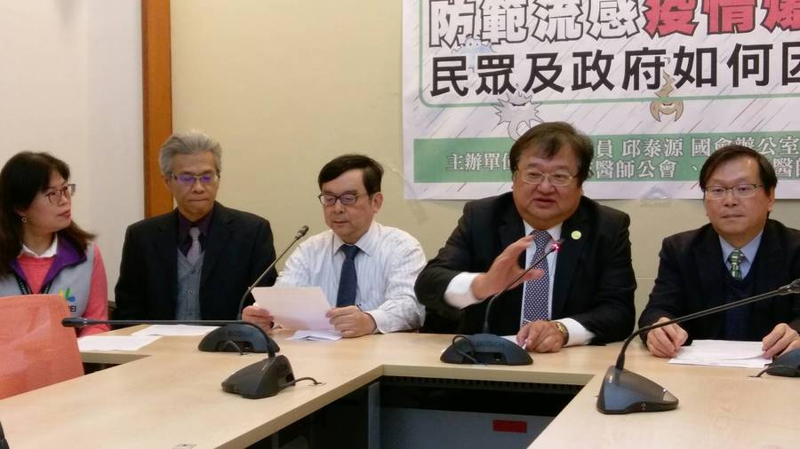 流感來勢兇,新北醫師公會周慶明(左2)、台大醫院黃立民教授(左3)、理事長立委邱泰源(右2)、疾管局張人祥副署長(右1)產官學聯手防疫渡寒冬。(photo by 楊凡恩)