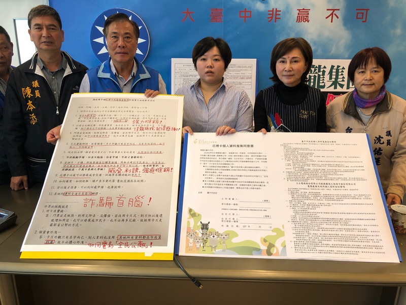 國民黨議員顏莉敏、楊正中、黃馨慧、陳本添在記者會等人指責林佳龍,利用花博卡的發行,要求市民申辦時要填寫個人資料蒐集同意書;要求說明理由卻講得不清不楚。且花博卡的製作是發包給沒有大型展覽及門票代售經驗的三立電視,其居心令人難以理解。