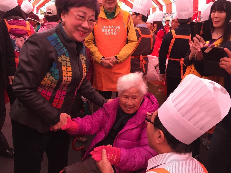 呂秀蓮在人潮擁擠的隊伍前,親手送年菜給老人們,現場如同農曆新年氣氛一樣熱鬧,時不時可以耳聞老人們的開懷大笑。呂秀蓮走到哪,老人們手就拿著相機或手機跟到哪,像是追星的粉絲一樣,模樣可愛。