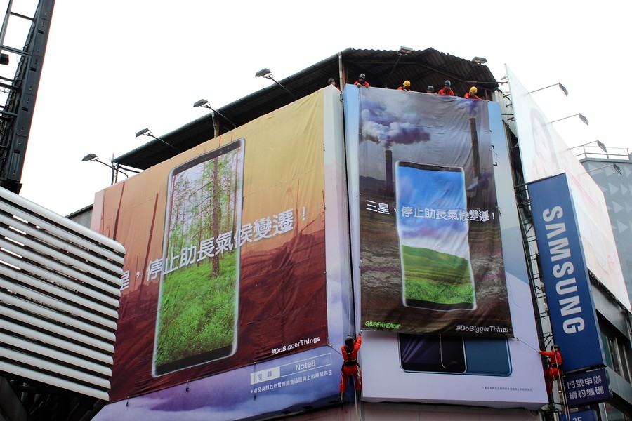 為讓三星正視消耗能源帶來的氣候變遷,綠色和平組織展開全球串聯行動,30日同步在台灣、韓國與德國發起,在位於西門町的三星直營店大樓外,掛上9公尺長的巨幅布條,內容諷刺再美的手機濾鏡,都遮蓋不了三星大量消耗化石燃料,加速氣候變遷的事實。並要求身為電子產業的龍頭品牌,應帶頭減用化石燃料,負起企業責任,提出再生能源具體時程表,加速產業轉型。