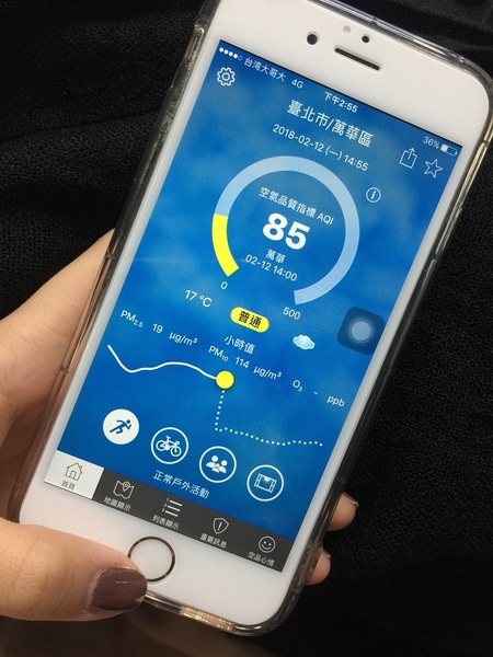 「在環境即時通App可以再提供12小時間、每個小時的預測資料。」張順欽也指出,App提供服務,包括空氣品質指標、PM2.5濃度,是否適合外出活動等資訊,全部以圖像化在手機螢幕上呈現,民眾每日通勤上班、戶外運動及學校戶外上課前,都可先規劃當日最適合的戶外活動時段。