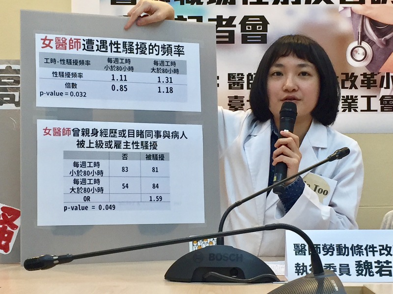 「醫師長工時,助長性騷擾歪風。」魏若庭表示,衛福部去年公告住院醫師每週工時不得超過80小時,目前工時超過上限者仍不在少數,但調查發現,「每週工時超過80小時者,遭遇性騷擾的頻率、曾親身經歷或目擊同事遭上級騷擾的比例,比工時符合標準者來得高,」可見工時長不僅對勞工身心健康有負面影響,也讓職場性別友善的推廣寸步難行。
