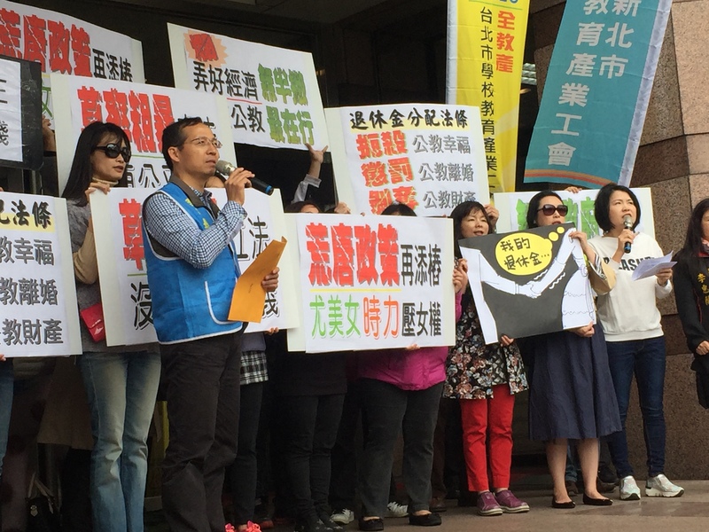 【台灣醒報記者楊蕓台北報導】「不幸遇人不淑要以離婚收場,退休金還要分享給前夫,情何以堪?」公教人員退撫新制給予離婚配偶「年金請求權」,最高可要求1/2退休金,引起全國教育產業總工會等教團反彈,15日前往民進黨中央黨部陳情。理事長黃耀南表示,雖然法條有限制「沒有退休金」的離婚配偶才能向公教人員請求,但像是老闆、律師等職業也沒有退休金,不代表都是經濟弱勢,教團批評此法是懲罰離婚公教的職業歧視,應修法並暫緩實施。