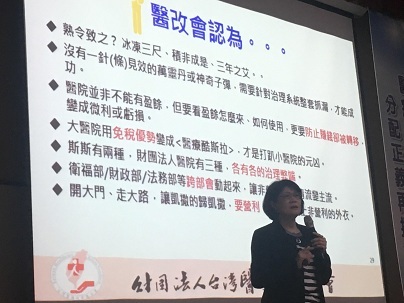 【台灣醒報記者宋秉謙台北報導】「醫療組織區分為營利與非營利是可行的做法,明訂非營利法人需符合公益準則,達到開大門走大路,避免步入灰色地帶。」醫改會董事長劉淑瓊22日於第3波健保改革研討會中,要求各界應正視非營利組織財團法人的財務透明。她強調,這是醫療界的轉型正義,呼籲立法機關針對董事監理問題及關係人爭議修法,以防「球員兼裁判」及「誤把捐贈當投資」發生。