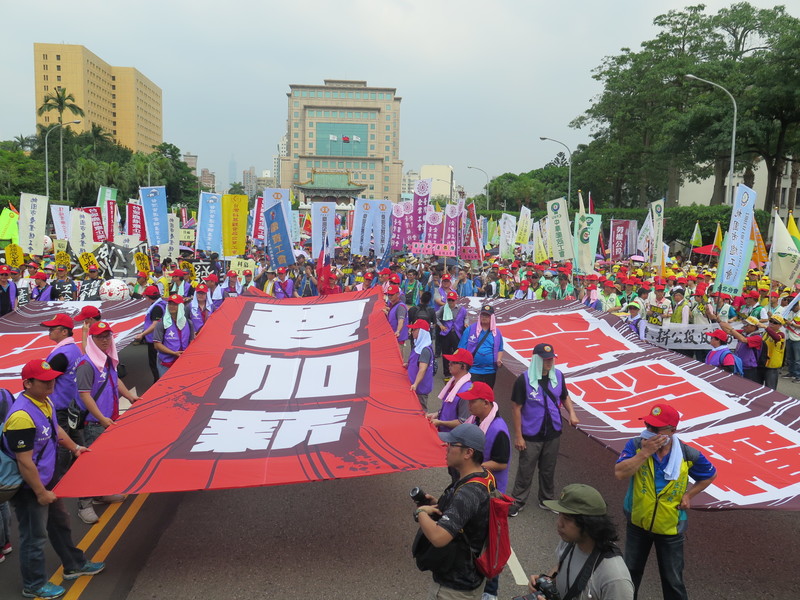 【台灣醒報實習記者貝薈涵台北報導】「反過勞、拚公投、要加薪、爭勞權!」喊口號的聲音此起彼落,適逢五一勞動節,全台工會及工運團體1日在凱達格蘭大道聚集、遊行。1萬人在「勞動者戰歌」的歌聲中出發,聲勢浩大。除了提出恢復7天國假、加薪10%、勞保年金維持現制、保障公務員權利、保障工會活動權、勞工董事法制化等6大訴求,現場兩側也設置攤位,供民眾連署公投。