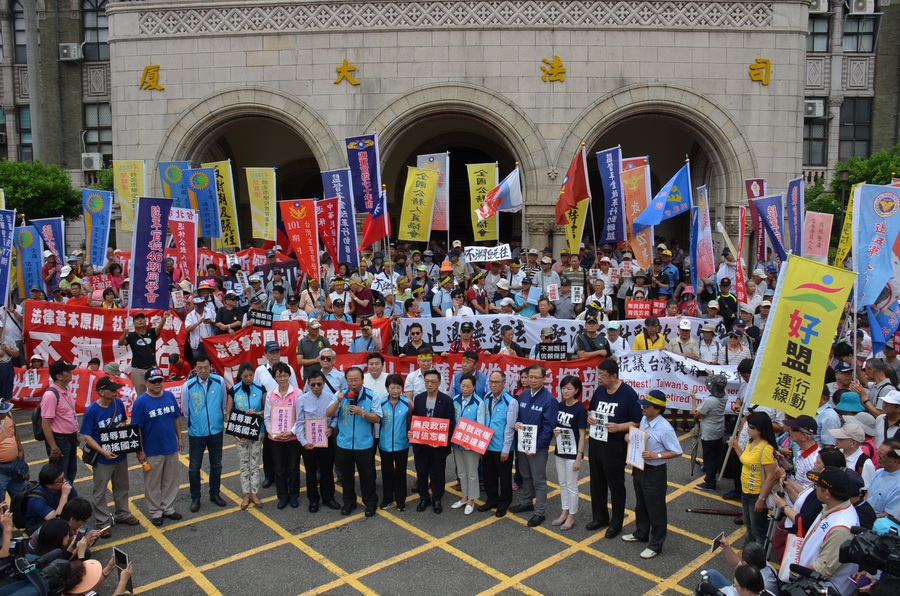 【台灣醒報記者楊蕓台北報導】不滿蔡政府年金改革,八百壯士等反年改團體13日前往司法院聲請釋憲,國民黨13名立委大舉到場聲援。立委林德福強調,國民黨不反對年金改革,但要讓軍公教都心服口服,且法律不能溯及既往,軍公教勞的年改應一併實施;副指揮官吳斯懷則說,13日先提公教版釋憲聲請,下周民進黨若強行通過軍改,將再連署提出軍人版釋憲。