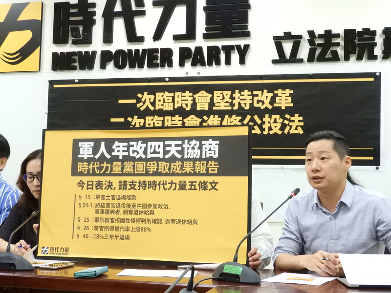 時代力量黨團19日則召開記者會重申立場,除了希望軍改能順利在7月1日與公教年改同時上路,另有5項條文盼能獲得院會支持,第一是「軍官士官退場條款」,洪慈庸表示,現行僅有士兵有退場機制,讓不適應者提早離開軍伍;但軍官、士官除非患精神疾病或被記兩大過才可退役,對軍中穩定性和士氣不良,因此希望推動一個正常申請的管道和機制,此條在上週協商時已獲得初步共識。