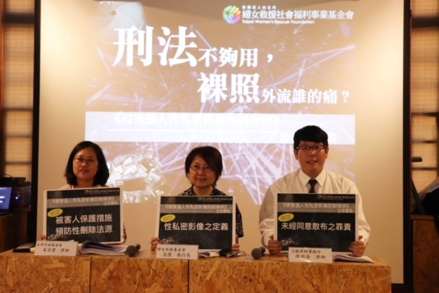 婦援會在2017年特別成立專法小組,經過1年研擬,完成《侵害個人性私密影像防治條例》的草案。根據該草案,未來未經他人同意,從事偷拍或紀錄他人性私密影像的行為將處以最高5年徒刑;電視、網路媒體任意記載被害人姓名也將處以10萬至100萬元罰鍰。