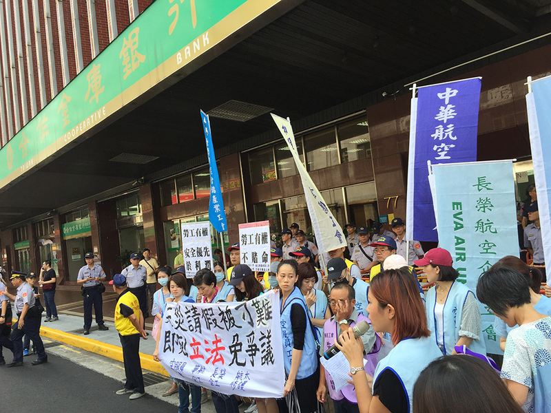 「天災請假被刁難,即刻立法免爭議!」桃園市空服員職業工會、長榮、華航企業工會、台灣航太修護產業工會30日攜手多名現役空服員於記者會高呼口號,要求勞動部立法約束業主對員工請天災假的種種不合理懲處!過去長榮航空常有颱風天搏命飛行,因違反民航法而受罰的慣例,儘管目前航空公司對於颱風天放飛已較謹慎,但卻進一步限縮員工請假權利,要求員工上班待命。