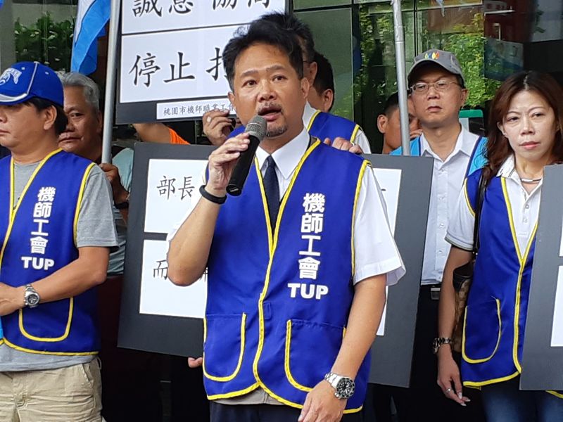 「資方無意協商,工會無奈投票。」桃園市機師職業工會31日聚集約20人在交通部前面抗議並高喊口號,機師工會理事長兼長榮機長李信燕說,「之前2016年梅姬颱風侵襲台灣,但長榮航空照飛,不少人因此加入機師工會爭取飛安。」