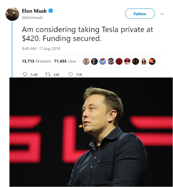 根據《英國廣播公司》報導,特斯拉執行長伊隆.馬斯克於加州時間7日下午在推特表示,將以每股420美元,約比現行股價高出25%的價格,全數購回特斯拉股票,將特斯拉下市成為私人企業。由於以往馬斯克透過非正式管道發表的訊息少有公信力,如曾在愚人節推文開出特斯拉將破產的玩笑,特斯拉股價一直到全體員工收到一封正式聲明後,才大幅躍升,成長11%至每股380美元。
