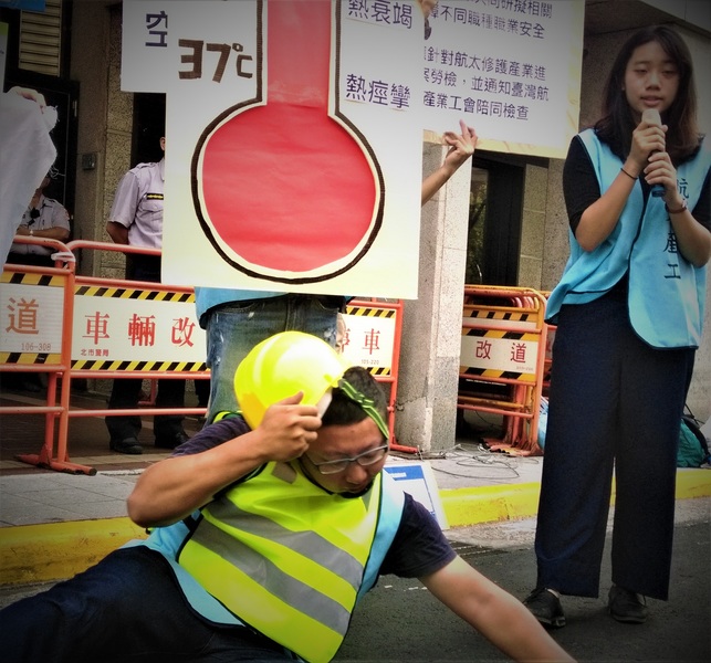 機坪工人全副武裝,頂著50度以上的高溫工作,體力逐漸透支而倒在勞動部前的馬路上。華航、長榮與航太修護產業工會9日舉辦「高溫假立專法,保障勞工職安」記者會,上演高溫熱倒行動劇。周聖凱表示,目前僅有「高溫作業勞工休息時間標準」針對「室內高溫作業」有明確規定,如鍋爐、鍛造等高溫行業,雇主須依標準給予勞工休息時間、飲水等,但其它室內外工作者卻無明確規範。