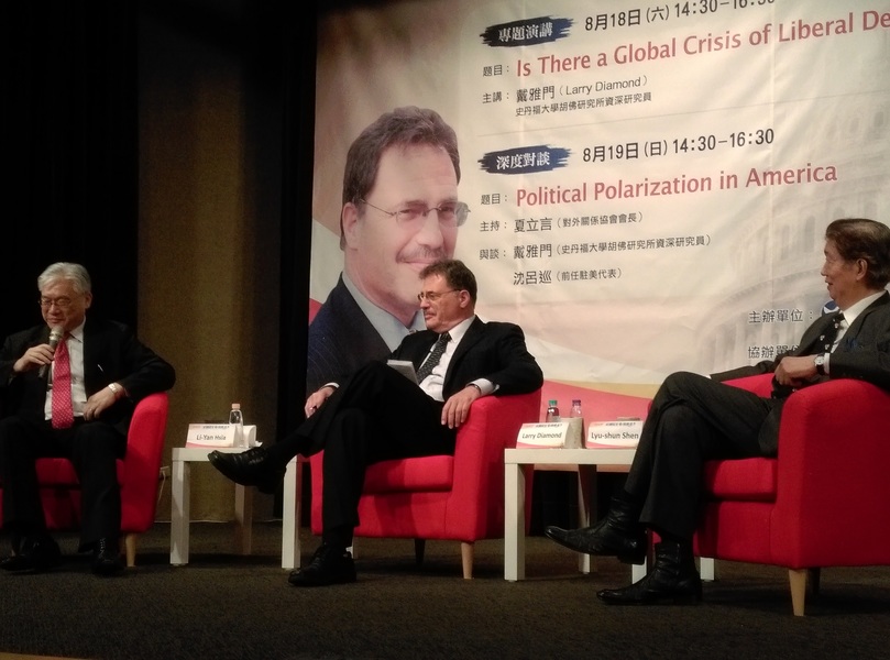 長風文教基金會19日舉行「美國民主往何處去?」講座,邀請世界知名民主研究學者戴雅門和前駐美代表沈呂巡對談,前行政院長江宜樺和前總統馬英九都在台下靜靜聆聽,足可見其大師功力。戴雅門提到,美國政治困境與政治兩極化有關,近年來因美國國會左、右派歧見日趨擴大,「共和黨越往右派傾斜,民主黨則漸趨左派。」兩派敵意升高,增加通過法案的難度。