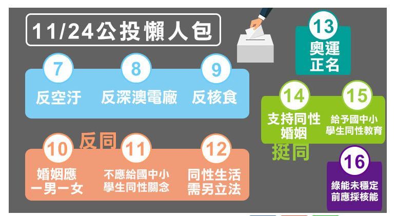 本周六(24日)投票日,將有10個公投案綁大選,包括國民黨反空污、反深澳、反核食3案、下一代幸福聯盟的愛家3案、平權公投小組2案、東奧正名1案與以核養綠1案。為防民眾記不得哪個要同意、哪個要不同意,中選會表示,民眾可以帶小抄投票。