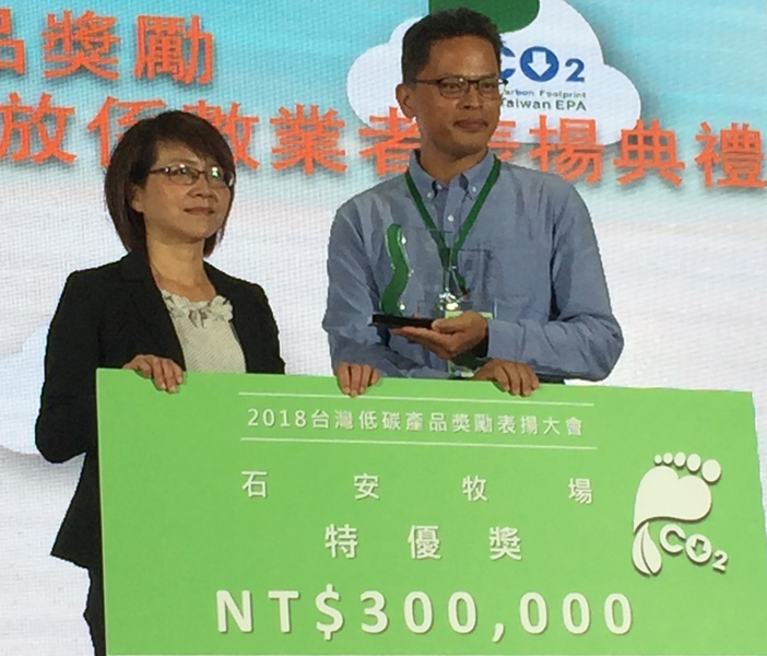 今年度頒發的低碳產品獎中,以石安牧場表現最為亮眼。石安牧場積極建置再生能源系統,設置了「雞糞沼氣發電機」。每日利用牧場內排放的禽糞和廢水,進行沼氣發電,減碳成效高達59.27%,也因此獲得特優獎的獎勵。