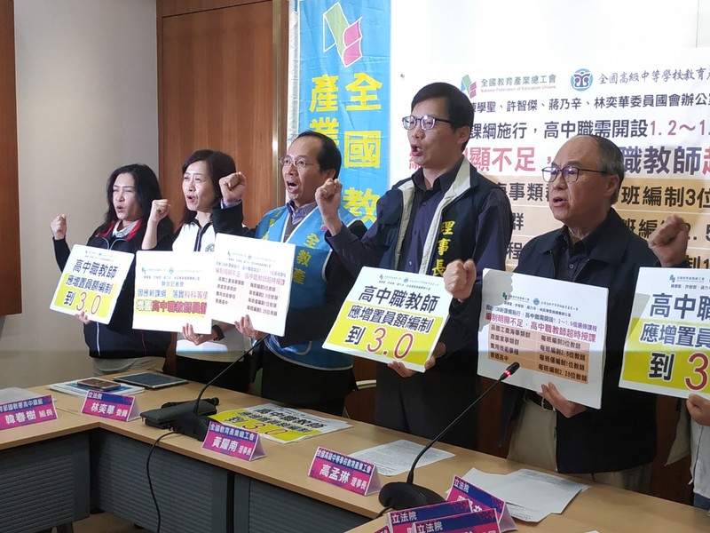 【台灣醒報記者張朝瑋台北報導】新課綱即將上路,但教師人力未能跟上?教育部去年公布高中教學節數標準,規定高中職各科教師教學每周時數應為16節,但實習組教師時數卻是18節,有差別待遇之嫌;加上新課綱內容依現有教師人力規範遠不足以應付。全國教育產業總工會因此會同立委9日召開記者會,呼籲教育部增置教師員額,落實科科等值。
