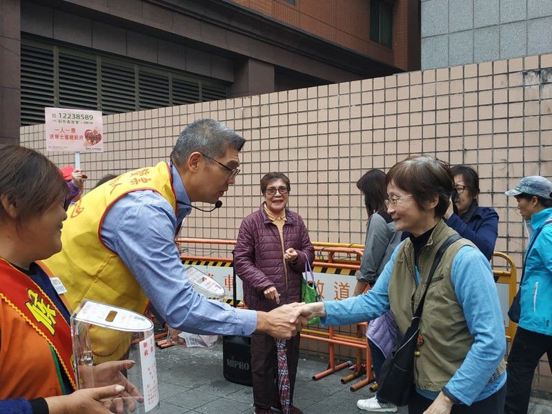 連勝文(左二)在街頭向路人「拜票」,為創世基金會寒士尾牙募款。(photo by 張朝瑋/台灣醒報)