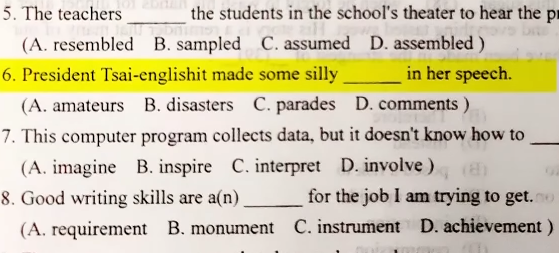 嘉義市一位高中英文老師在期中考的考試券上,自我矮化師道尊嚴,甚是犯了公然辱罵罪,故意用諧音提出了一個影射蔡英文總統的Prsedent Tsai English-shit(蔡英文屎)的粗魯侮辱,引起軒然大波。