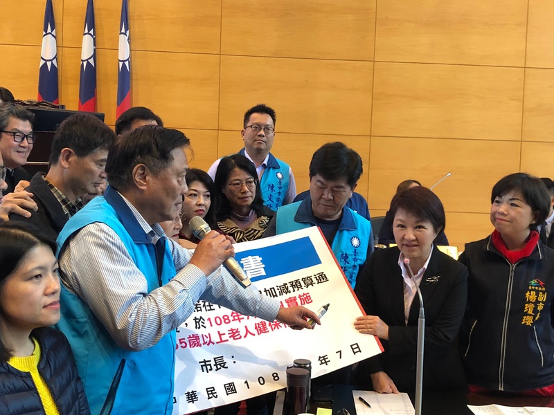為了市府能否順利在七月恢復老人健保費補助政策,國民黨議員楊正中拿著看板硬要盧秀燕簽字切結,以示對政見負責的決心。這事顯然事前沒有溝通好,楊正中在備詢檯前「嘟」了許久,盧秀燕硬是沒簽。