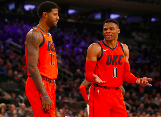 【台灣醒報記者宋秉謙綜合報導】隨著二哥喬治狀態下滑,NBA雷霆隊明星賽後進攻啞火,戰績一路跌到西區老八,很可能在季後賽「一輪遊」!由於「大三元製造機」威少本季命中率不佳,雷霆開季表現跌跌撞撞,但明星賽前一度靠著喬治燃燒自己,在二月時率領球隊帶著13戰11勝的強勢姿態,但隨後喬治體能下滑,戰績落後到老八,雖說跌出季後賽機率不高,但順位差、遇上高種子晉級情勢堪憂。