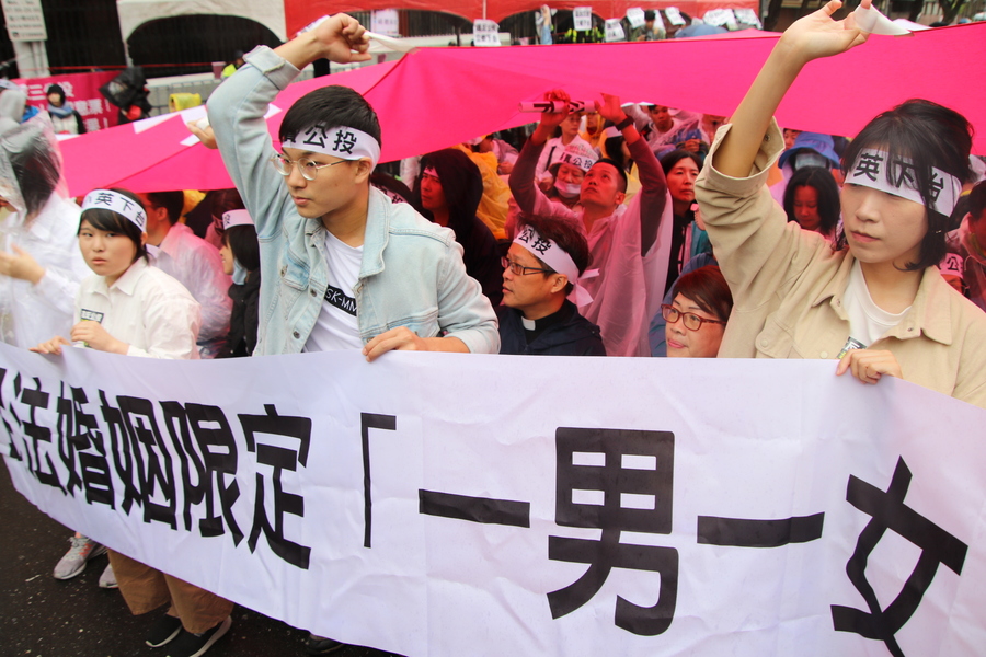 幸福盟8日號召萬人身穿白衣,集結立院旁濟南路上,即使天降大雨,仍澆不熄反同人士對立委及蔡英文藐視公投結果的憤怒。幸福盟指出,去年1124公投第10案「婚姻,應限定在1男1女之結合」是我國第一個通過的立法原則創制公投,並經由全國765萬選民認可,政府卻視而不見,仍試圖讓政院版同婚草案強行闖關。