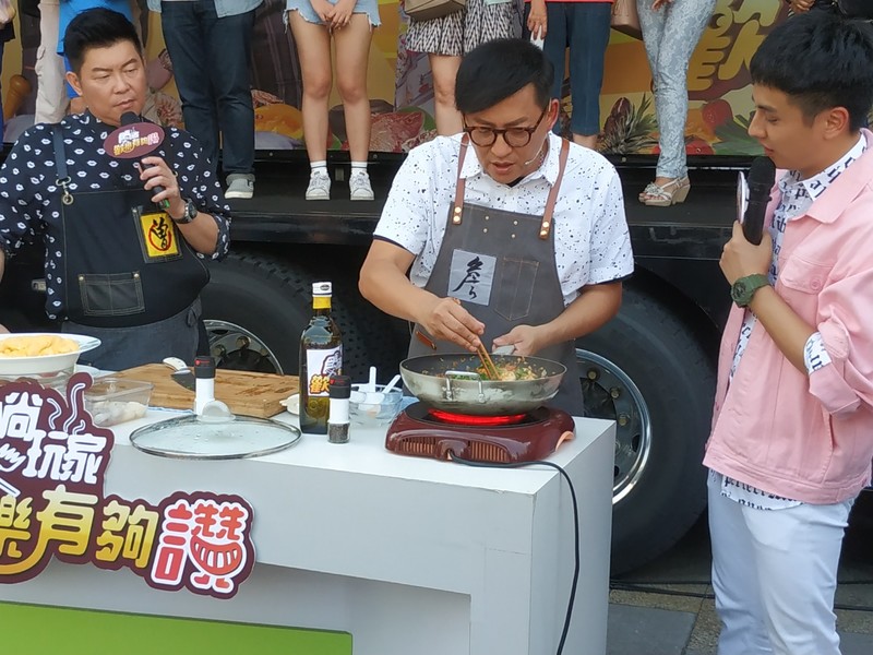 食尚玩家12日舉辦母親節活動,主持人詹姆士(中)一邊分享炒菜秘訣,一邊現場烹煮番茄炒蛋。(photo by 張朝瑋/台灣醒報)